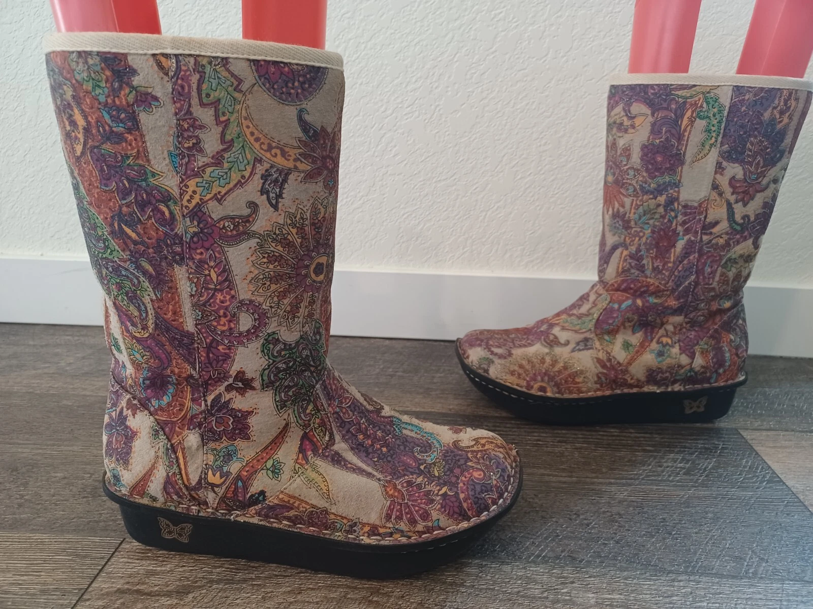 Elevate your footwear collection with the Alegria Sedona Paisley/Floral Glitter Fur Lined Boots, model SED-508. These mid-calf boots boast a chic paisley pattern set against a warm brown backdrop, ensuring they’ll complement any outfit with a touch of elegance. The comfortable slip-on style is enhanced by a soft fur lining, providing cozy cushioning with every step. Crafted with a leather outsole and insole, these boots promise durability and all-day comfort. The round toe design offers ample room for movement, while the flat heel style keeps your feet feeling level and stable. A regular calf width and standard shoe width make these boots a great fit for Women’s Size 8.5 (EU Size 37). Whether you’re stepping out for a casual day or dressing up for an evening event, these Alegria boots are sure to be a go-to in your wardrobe.