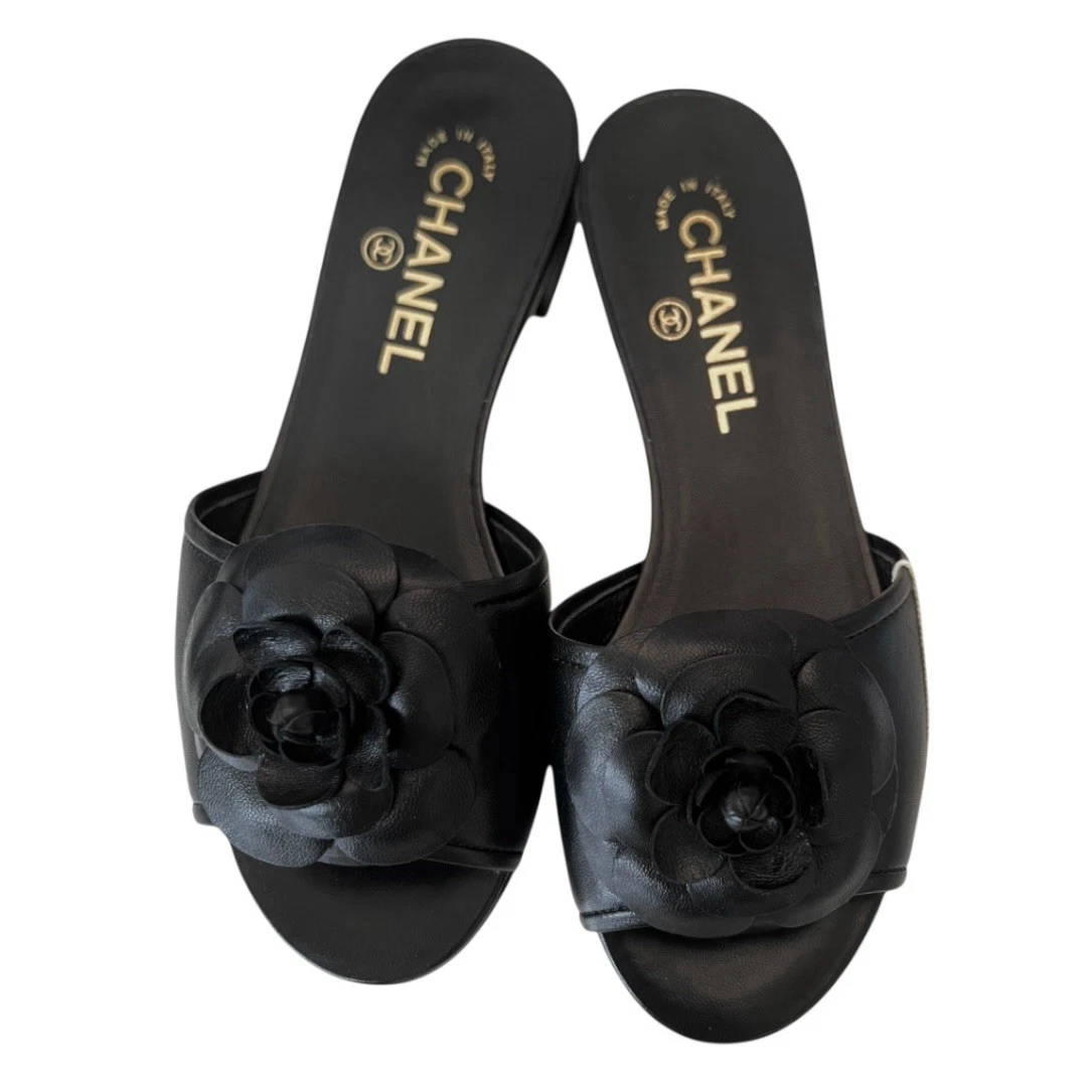Chanel Signature Camellia Flower Black Leather Mules Sandals CC Logo Gold-Tone Hardware