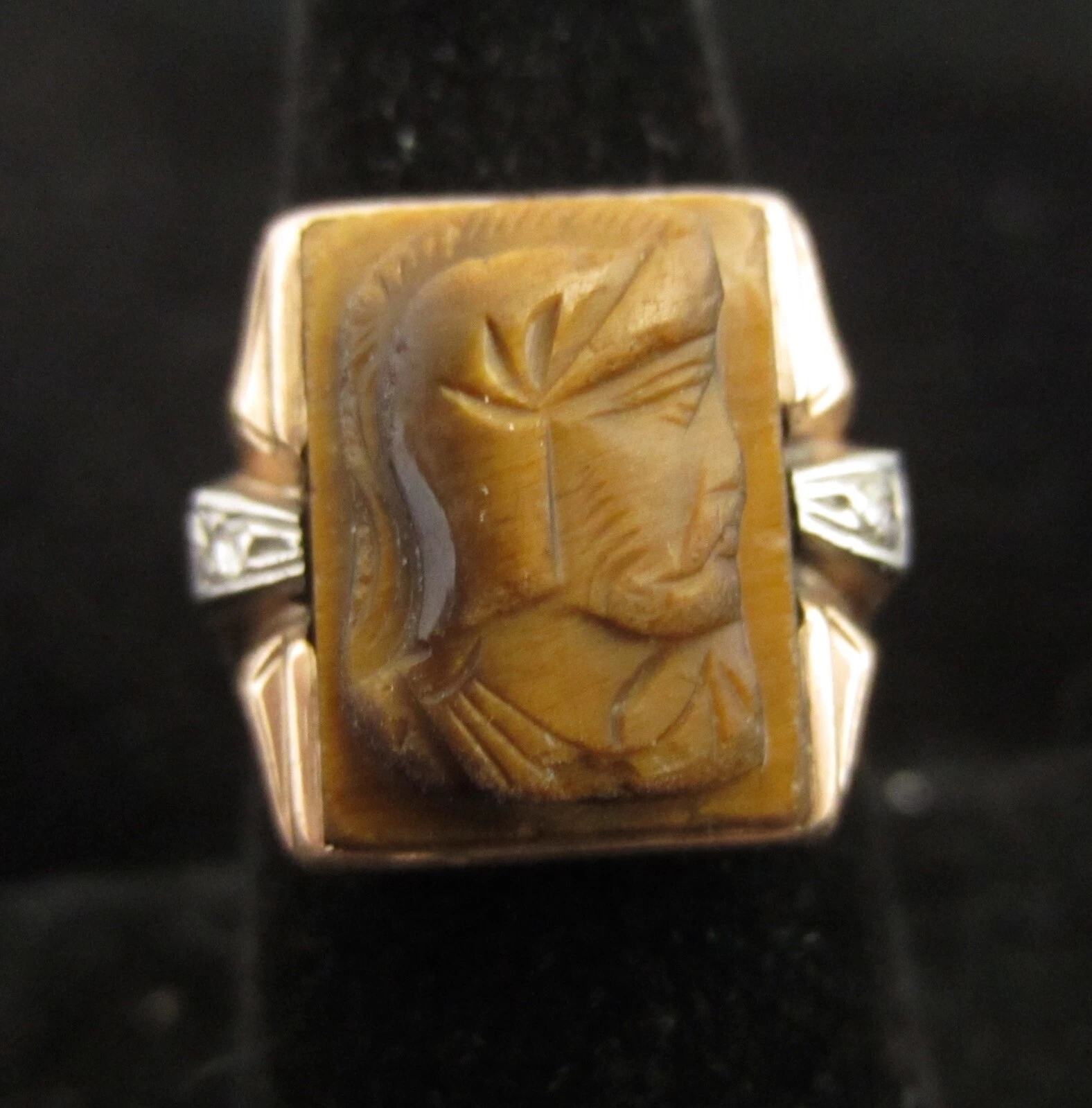 Here is a vintage 10k gold Roman gladiator signet cameo ring with a diamond to either side. The inside band is inscribed ‘HAZEL to JOE 1941’. The ring is a size 8 1/2. You will receive the exact ring as pictured in the listing.