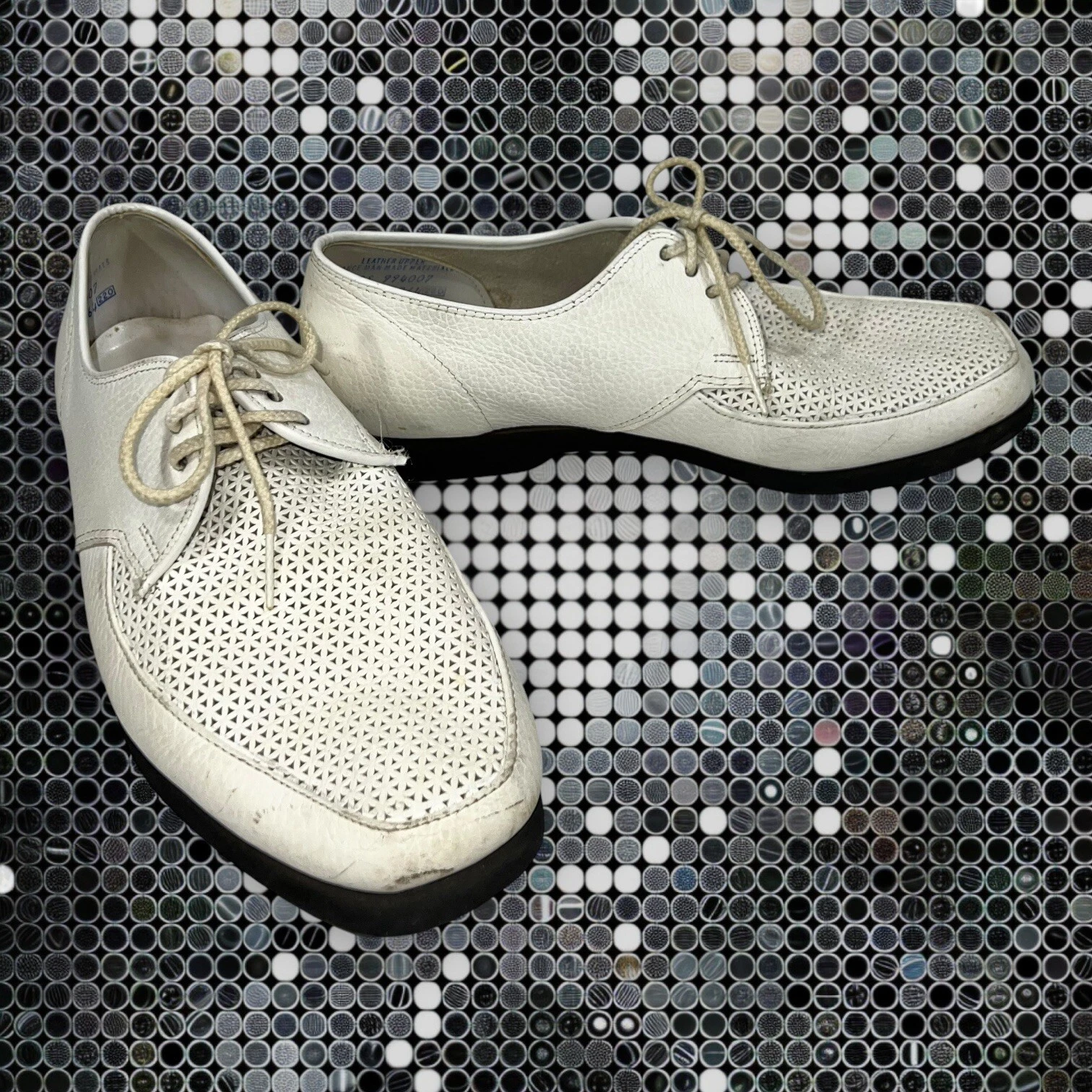 Vintage 1970s Sears men’s size 7 white leather basket weave cut out oxfords with black foam sole. They are on the smaller side. Soles measure about 10 1/2” heel to toe following the curve on the inside and are 4” at widest across the bottom. Good condition with some dirt and wear. Some scratches, scuffs, and discoloring to leather. Soles have discoloring and wear. These are worn and have been used, but do have a lot of life left in them. See pics for details!