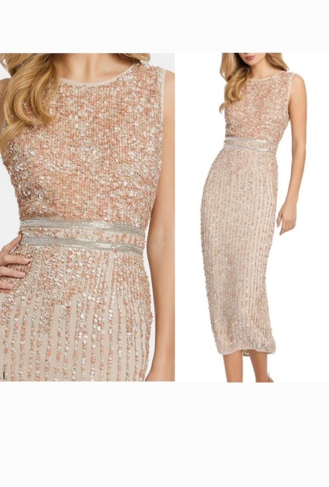 Mac Duggal Sequined High Neck Sleeveless Column Gown, Size 16. This stunning gown features intricate pink and silver sequin embellishments on a beige polyester fabric, perfect for formal events, galas, and special occasions. The column silhouette offers a classic and elegant look. Made in India. Excellent pre-owned condition.