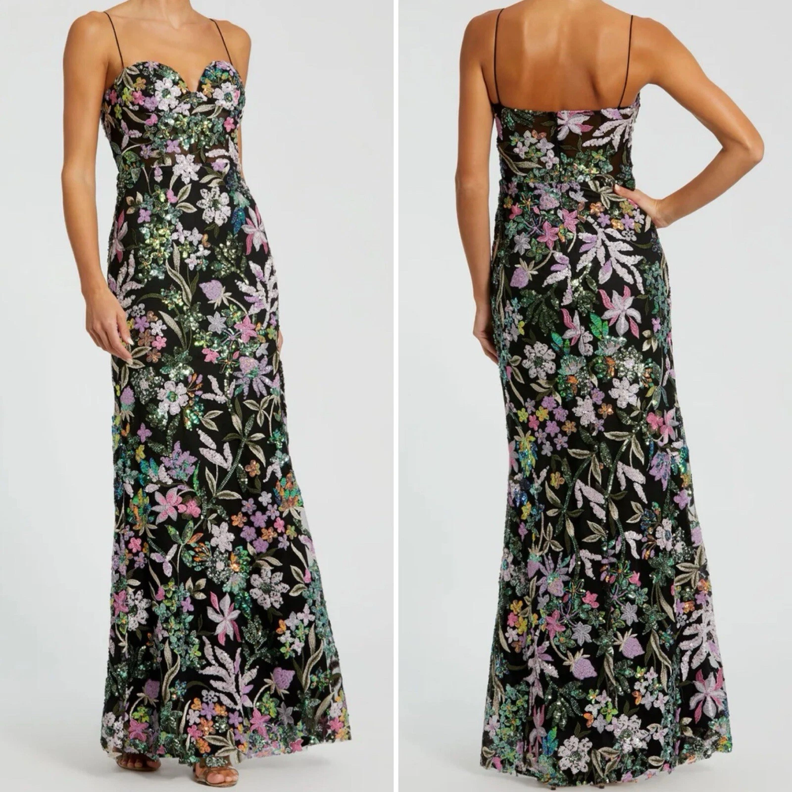 Mac Duggal Black Floral Sequin Spaghetti Strap Bustier Embroidered Applique Gown in size 12. New with tags. This gown features a romantic sweetheart neckline and a flattering bustier bodice. With delicate spaghetti straps and a sleeveless design, it offers a chic and feminine silhouette. Adorned with all-over stunning floral embroidery, this gown is sure to make you feel like a vision of beauty. Embroidered mesh overlay; 100% polyester lining. Fully lined through bodice and skirt. Sweetheart neckline. Sleeveless. Spaghetti straps. Bustier. All-over stunning floral embroidery. Concealed back zipper. Approximately 60″ from top of shoulder to bottom hem. Retail $498. Style #49827