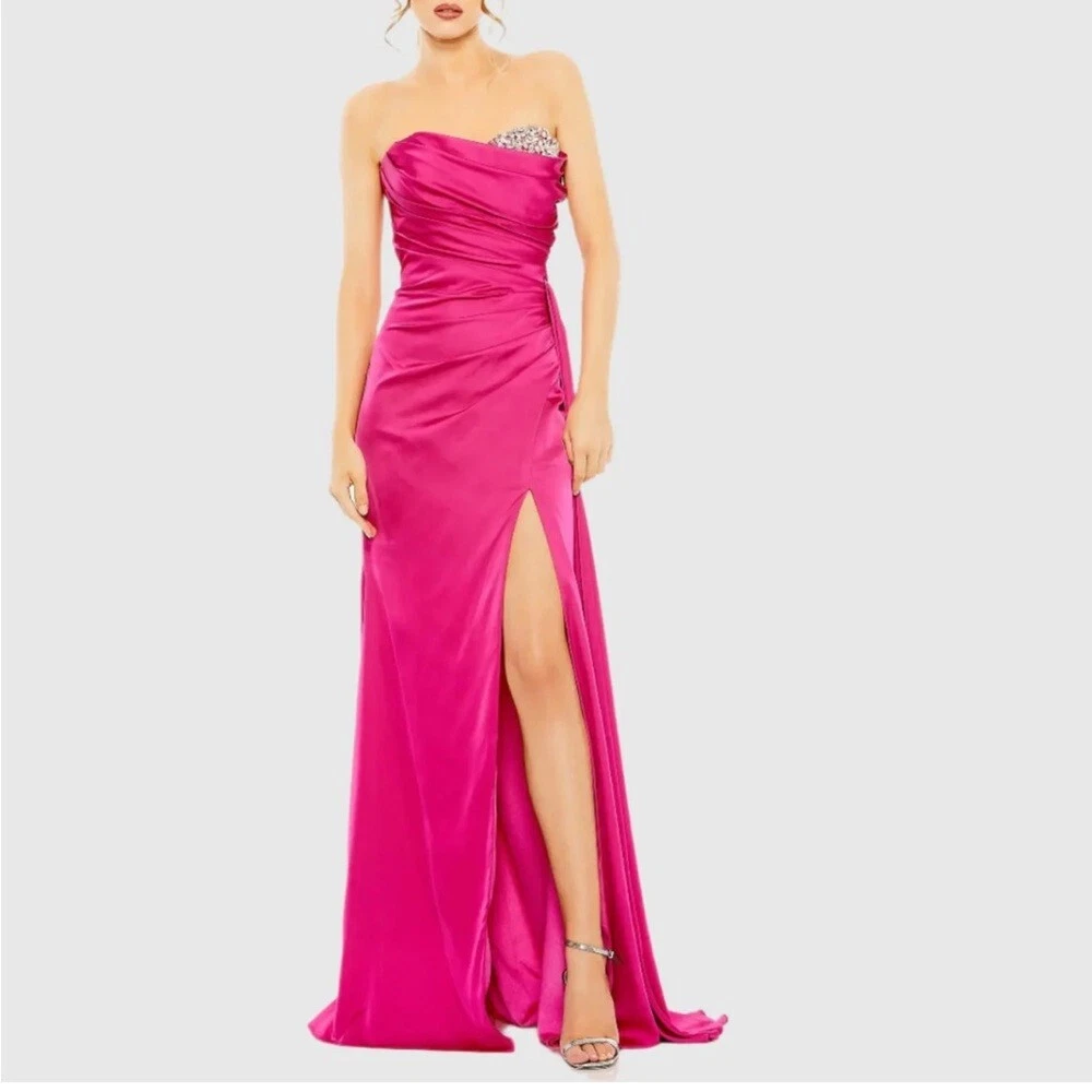 Radiate elegance in this Satin Gown, designed for unforgettable moments. Featuring a fully lined, strapless sweetheart neckline and a sleeveless cut, this gown offers a fattering, sophisticated fit. Dazzling rhinestone embellishments on the bustline elevate the look with a touch of glamour, while the high slit adds a sultry hint of allure.