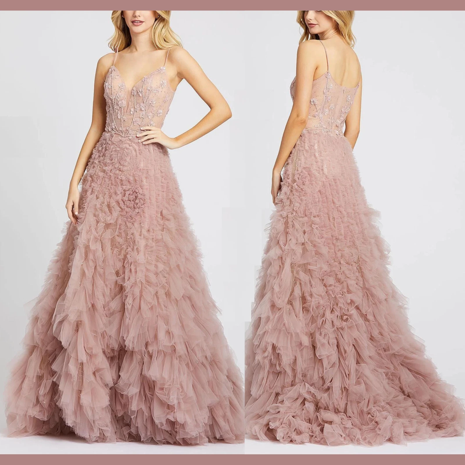 Embellished long gown with pearls and a small floral appliques on a lace bodice. Featuring a deep neckline with illusion with spaghetti straps and the A-line skirt thrives on tulle with a train.