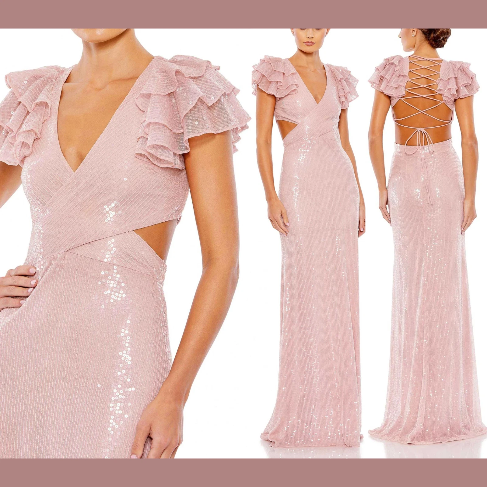 This fashion-forward maxi dress is crafted from hand-sewn sequins and is styled with a wrap-look bodice, fluttery ruffled sleeves, waist cutouts, and a sexy lace-up back.
