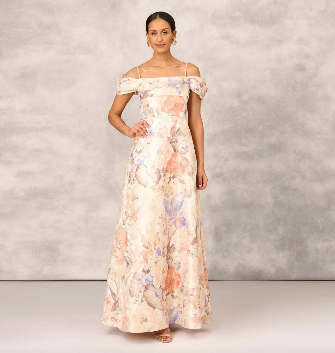 Cut in an off-the-shoulder silhouette, Aidan Mattox’s draped-sleeve gown features large painterly florals and layered metallic jacquard detailing. The flared style is finished with pleated detailing at the bodice.