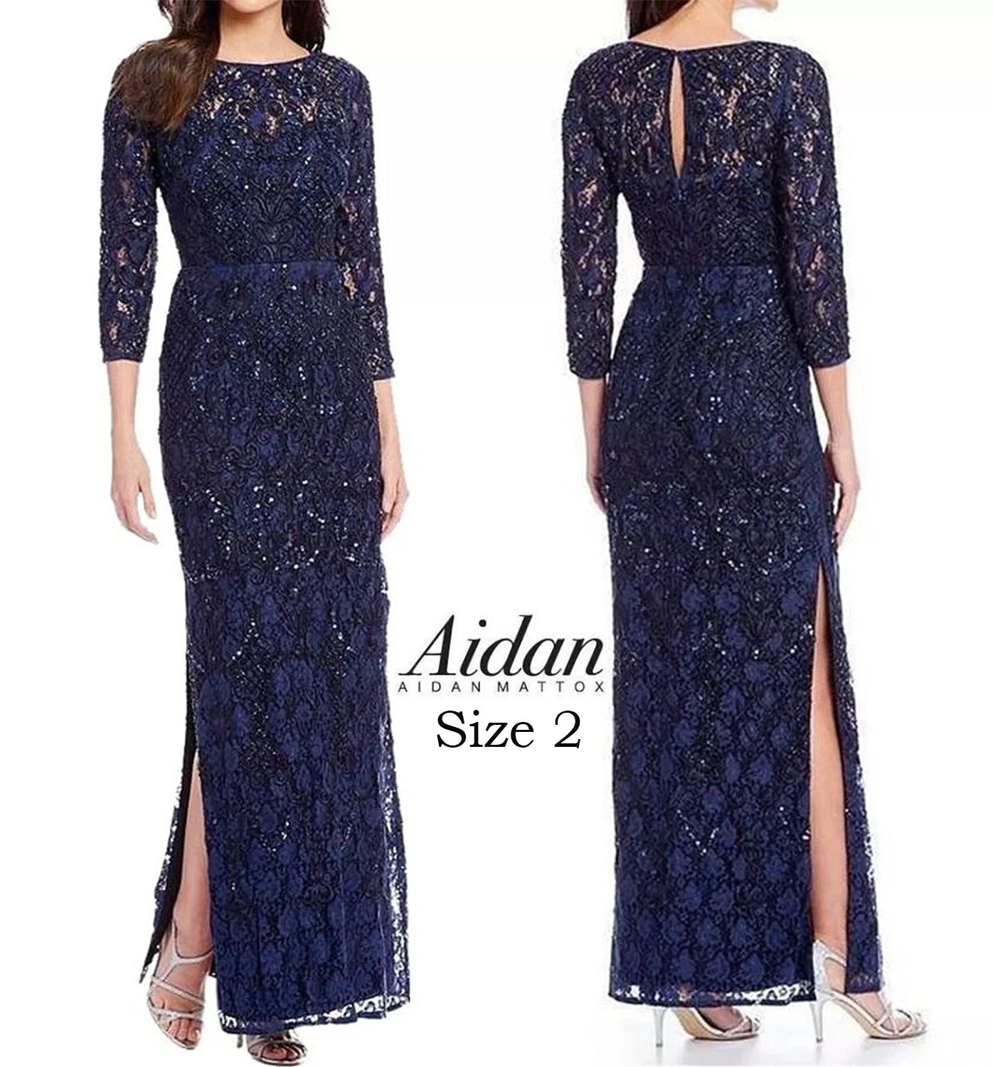 This stunning Aidan Mattox navy floral lace gown is perfect for any formal occasion. The dress features a scoop neckline, 3/4 sleeves, and a long dress length with a keyhole neck back. The gown is embellished with sequin accents that add a touch of glamour to the overall look. The dress is made of high-quality nylon material and features a lace fabric type that adds a beautiful texture to the gown. The dress is available in size 2 and is perfect for women who want to make a statement at any event. The zip closure ensures that the dress is easy to wear, and the blue color and flower theme add a touch of elegance to the overall look. This dress is perfect for weddings, parties, or any formal event.