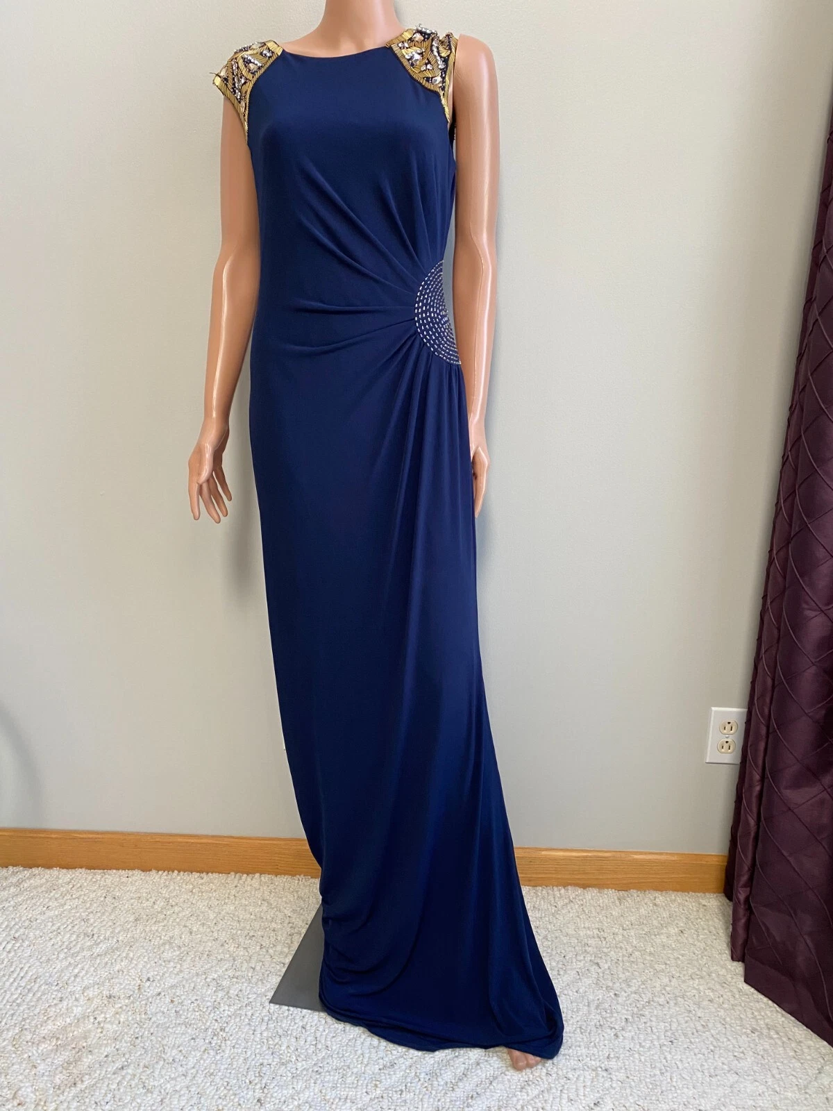 JS COLLECTIONS brand, cocktail/guest wedding dress in navy color, very elegant cut (size 8 – US) in new condition w/o tags. Domestic shipping via USPS Ground Advantage