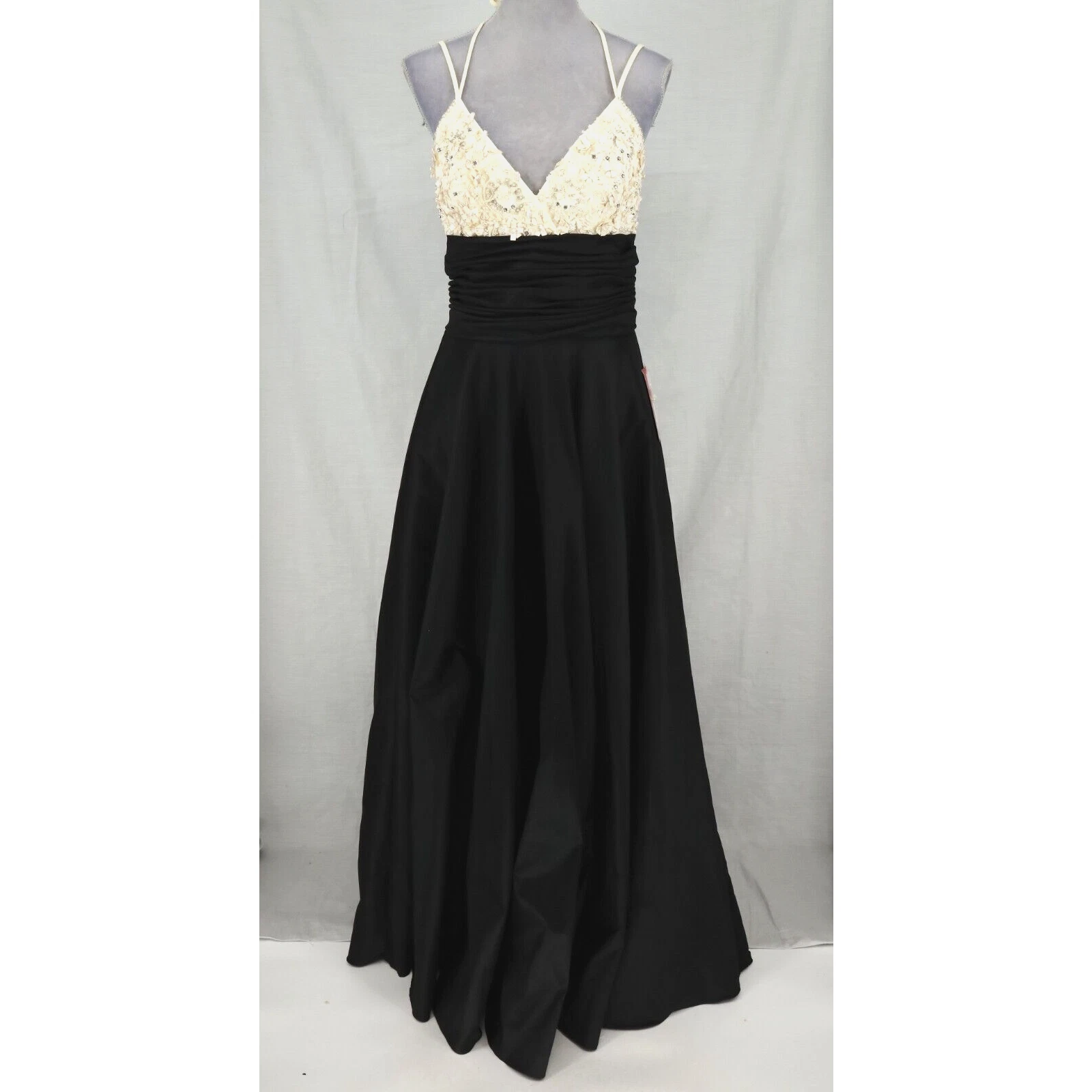 JS Collections Gown Women’s 8 Black Ivory Beaded Ruched Lined Strappy Dress New