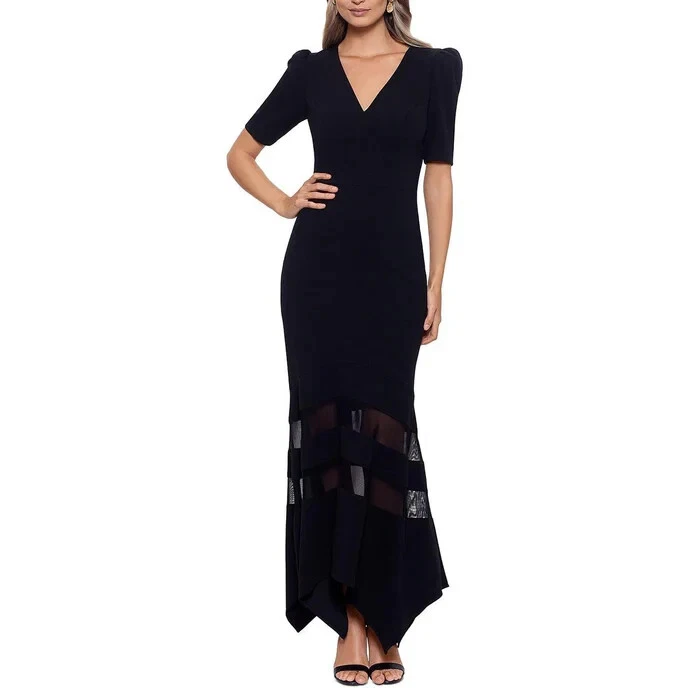 Mesh panels offer contemporary appeal to the skirt of a V-neckline gown that is crafted from scuba-like fabric.