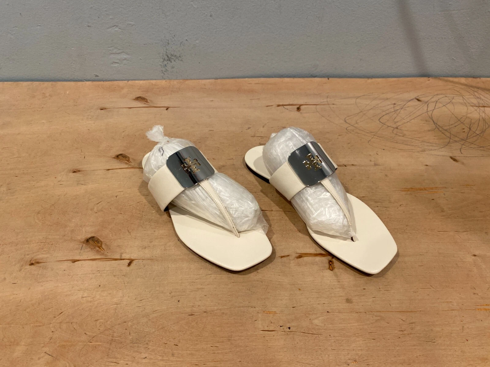+   New with Defect Tory Burch Georgia Thong Sandal ,  White Leather , Size 9.5. Defect: photo #7: discolored areas due to clean off glue residues