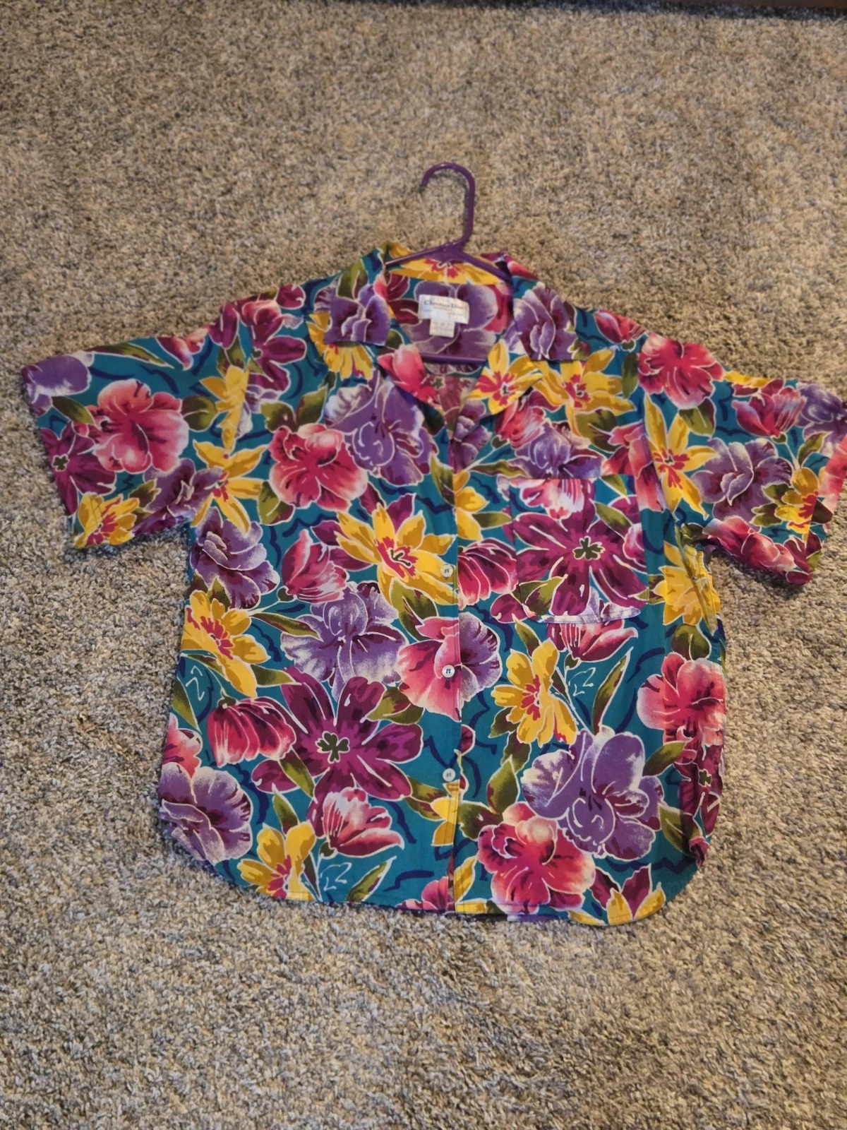 The Christian Dior Vintage Hawaiian Floral Top in size 14 offers a unique and stylish option for women looking to add a retro touch to their wardrobe. The floral pattern with Hawaiian theme adds a fun and tropical flair, while the form fit design and shoulder pads provide a flattering silhouette. Made by the renowned brand Dior, this top is sure to make a statement and stand out in any collection. Its is 100% rayon