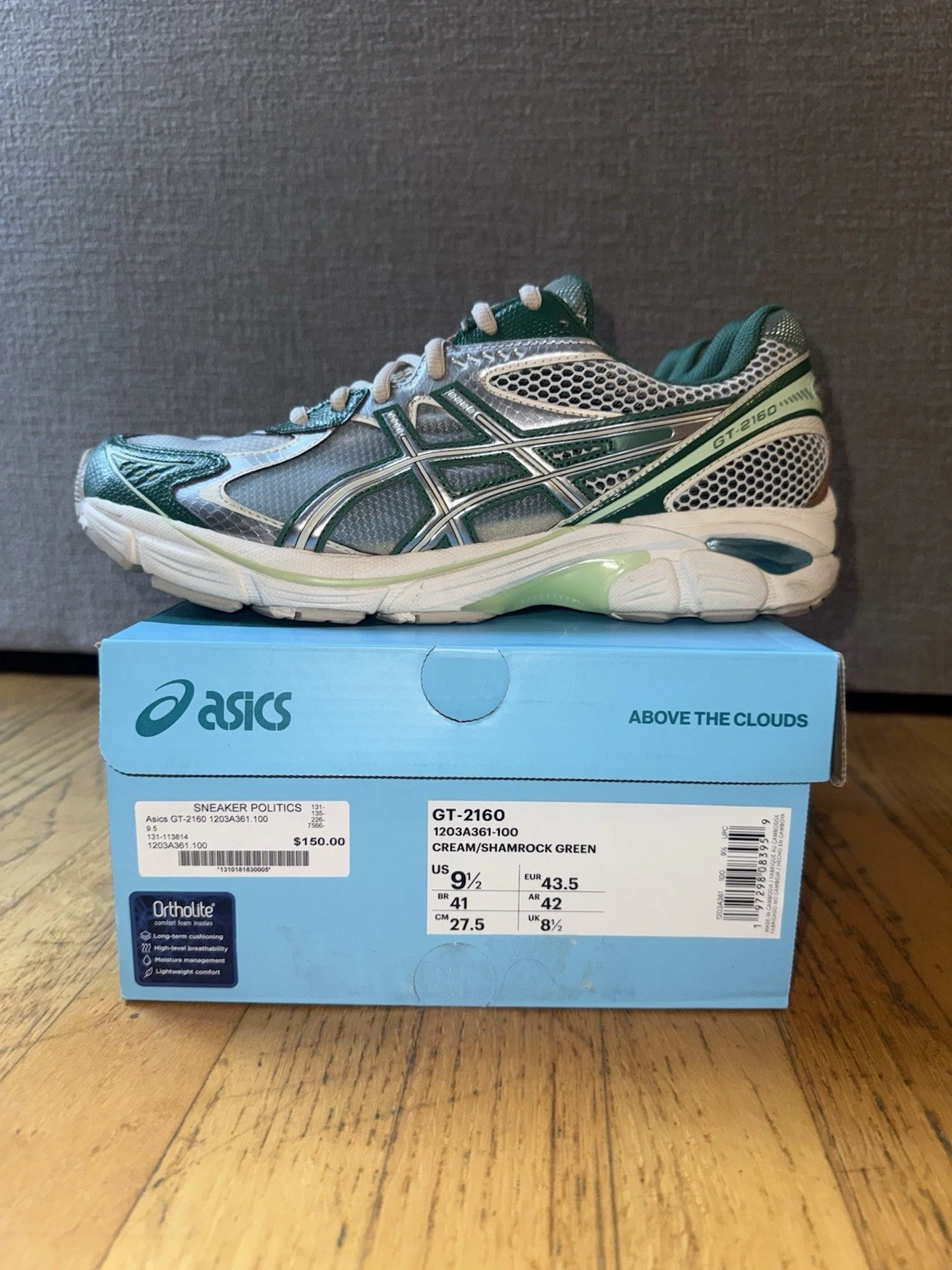 The ASICS Above The Clouds x GT 2160 Shamrock Green in size 9.5 is a stylish and athletic sneaker designed for men. Featuring a shamrock theme and a breathable mesh upper, this shoe is part of the ASICS GT product line and offers both comfort and performance. With its unique design and high-quality construction, this sneaker is a standout choice for those looking to make a statement with their footwear.