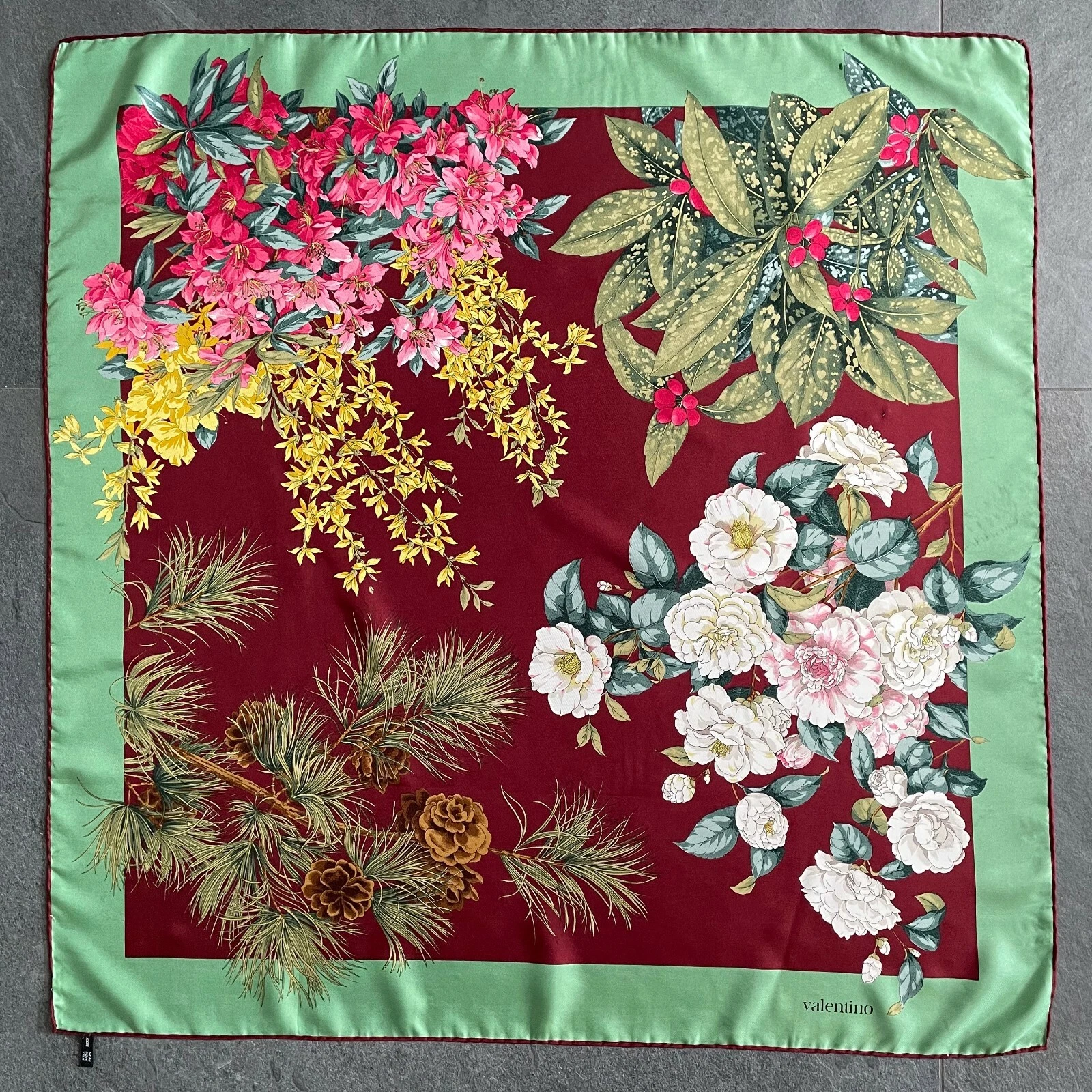 vintage VALENTINO burgundy silk scarf Floral with green border print size 34″
