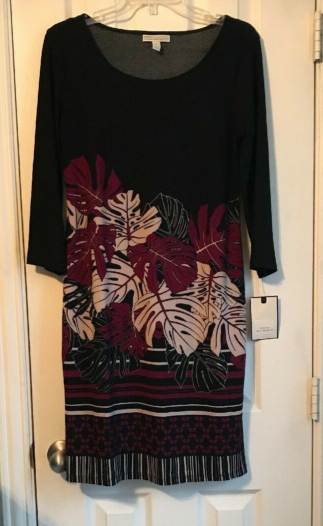 The Dana Buchman Black, Beige & Magenta Dana Essential Dress in size S is a stylish shift dress with a floral pattern. Made of 95% polyester and 5% spandex, the dress features a round neck, 3/4 sleeves, and a pullover closure for easy wear. With a knee-length silhouette, this machine washable dress is perfect for women looking for a versatile and comfortable option for various occasions.